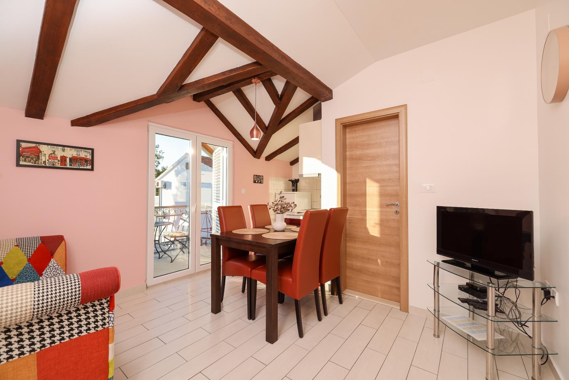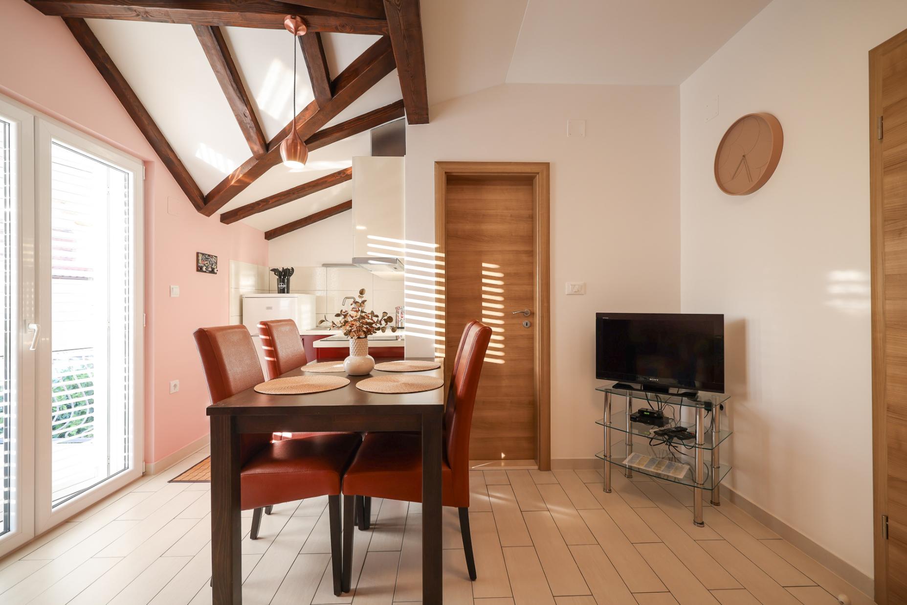 Apartment „Cherry“ is situated on the 2nd floor and consists of a bedroom, bathroom, kitchen with living room and balcony with a seaview. In the vicinity of the house is a parking place. The carefully designed apartment „Cherry“ provides a pleasant feeling for couples and smaller families.