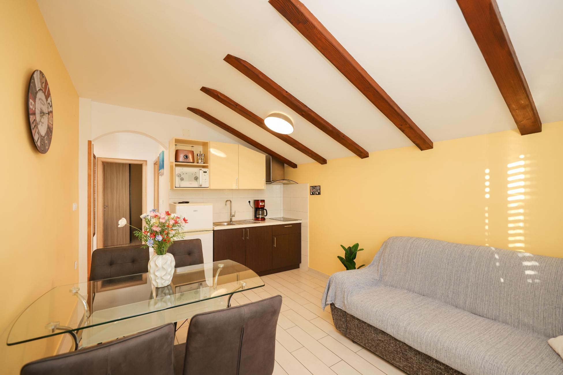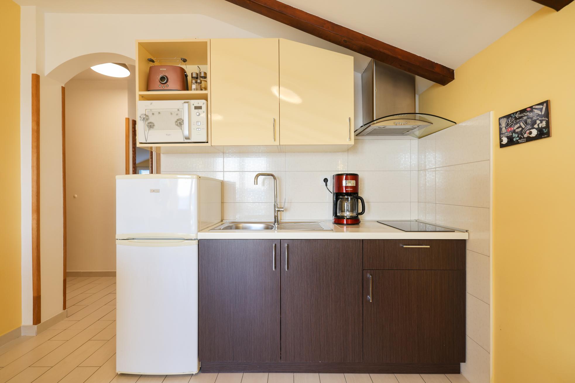 - Fully equipped kitchen (fridge with icebox, induction hob, microwave oven, toster and kettle)