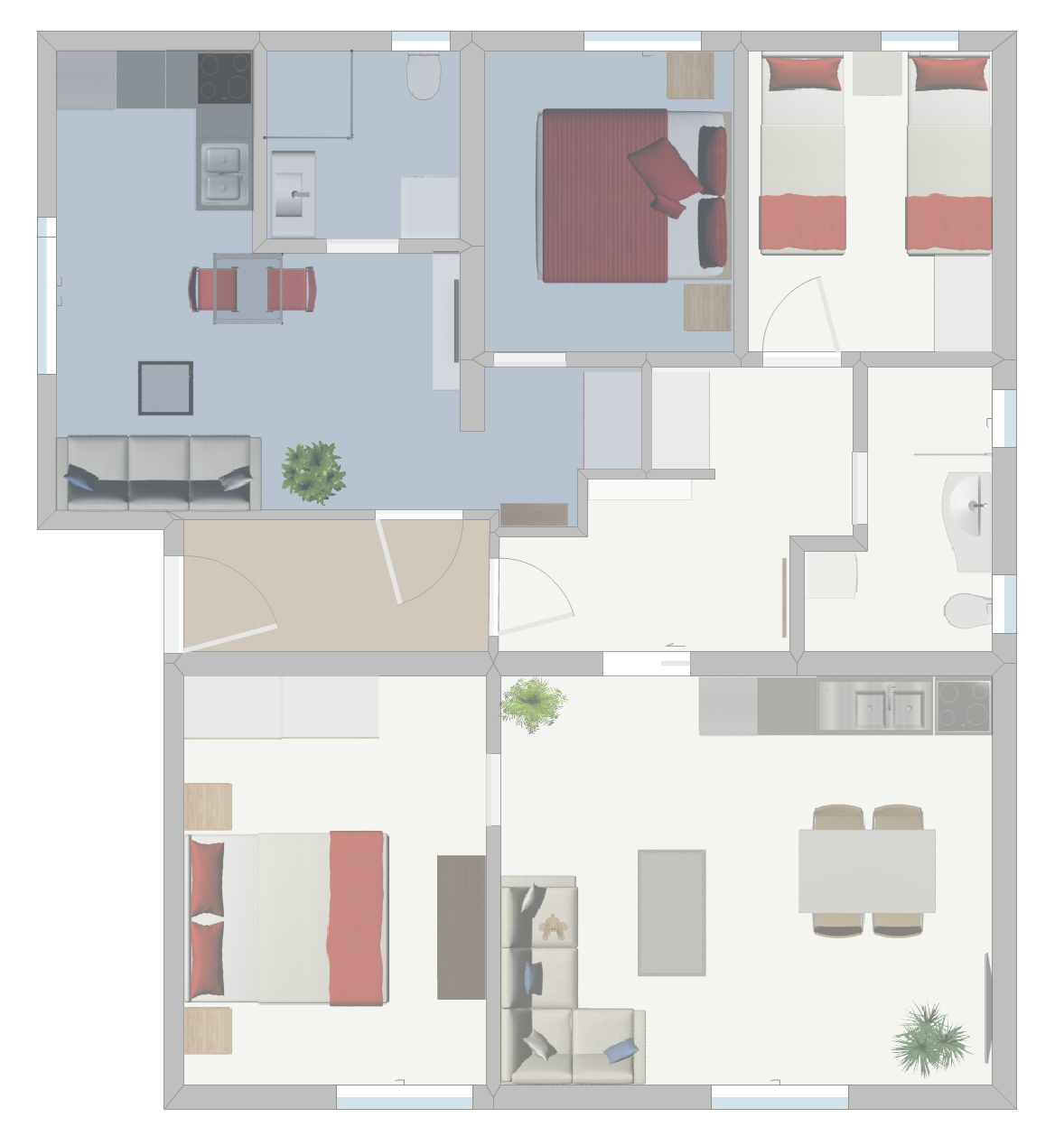 •  Fully equipped bathroom (shower, sink, toilet, washing machine)